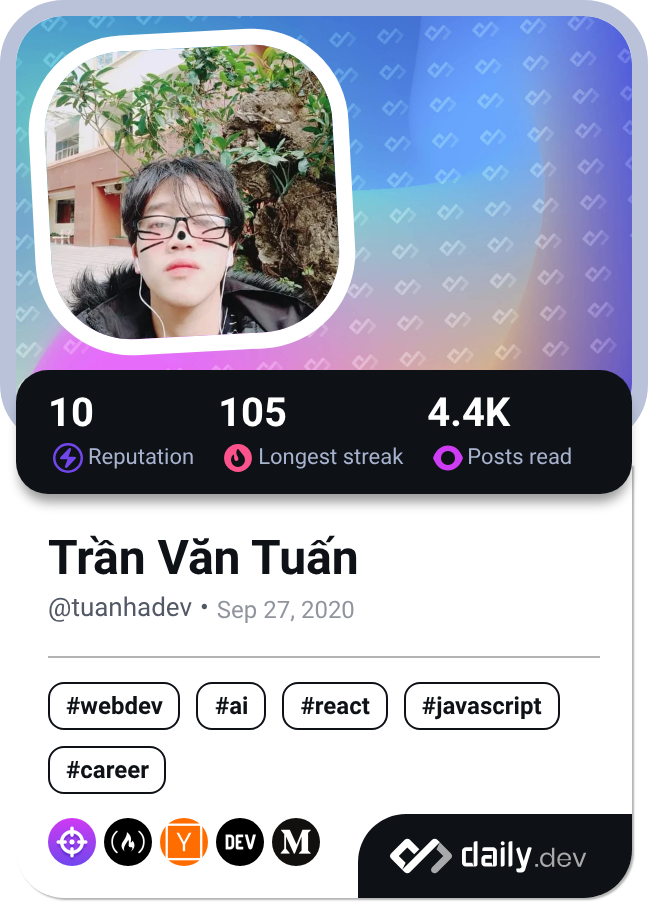 - Reading (here's my daily.dev card—and that's just counting one platform!)
